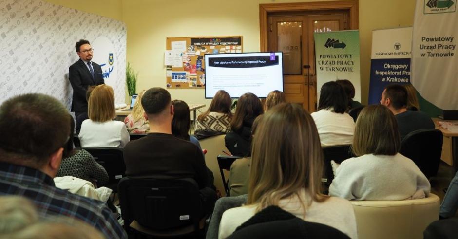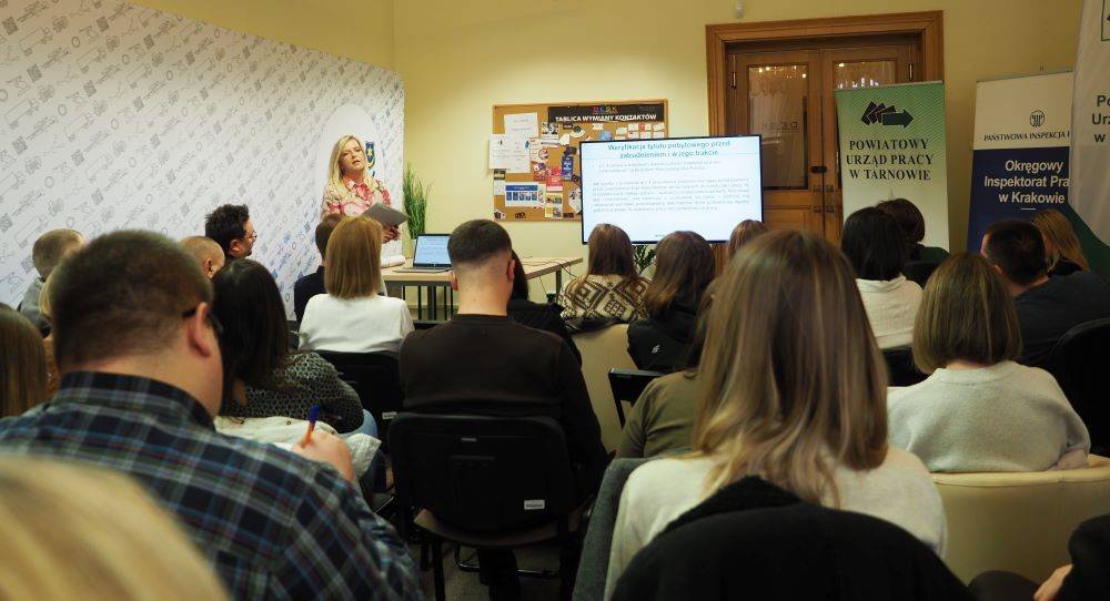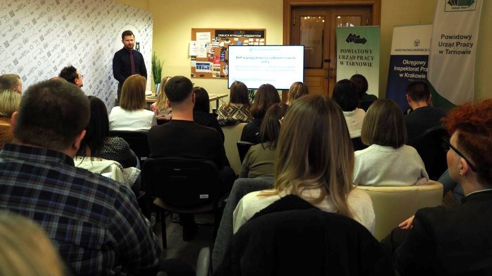 27 października 2025 roku w DESK Strefa Przedsiębiorcy w Tarnowie inspektorzy pracy Okręgowego Inspektoratu Pracy w Krakowie wspólnie z pracownikami Powiatowego Urzędu Pracy w Tarnowie przeprowadzili szkolenie dla pracodawców zatrudniających cudzoziemców. Szkolenie zorganizował Powiatowy Urząd Pracy w Tarnowie.